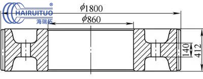 图1为某变速箱齿轮结构示意图,材质17CrNiMo6,重量3795 kg。齿面要求渗碳淬火处理,有效硬化层深度2.85~3.25mm,单边余量0.45mm,齿面硬度58~62HRC,心部硬度35~42HRC,金相组织符合机械行业标准JB/T6141.3-1992的要求,晶粒度不低于6.5级。力学性能要求:屈服强度ReL≥795MPa、抗拉强度Rm≥1079MPa、伸长率A≥8%、断面收缩率Z≥35%、冲击吸收功AKV(-40 ℃)≥25 J。